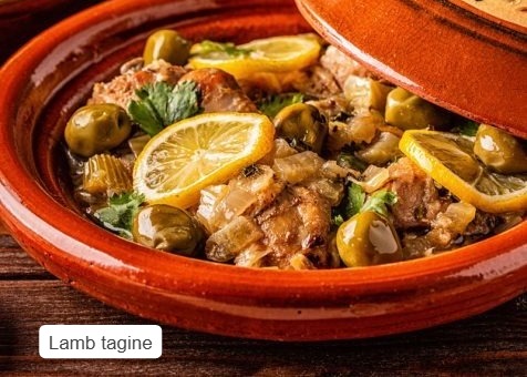 - Tagine: A slow-cooked stew with meat, vegetables, and sweet fruits like apricots, all cooked in a special pot with a cone-shaped lid.