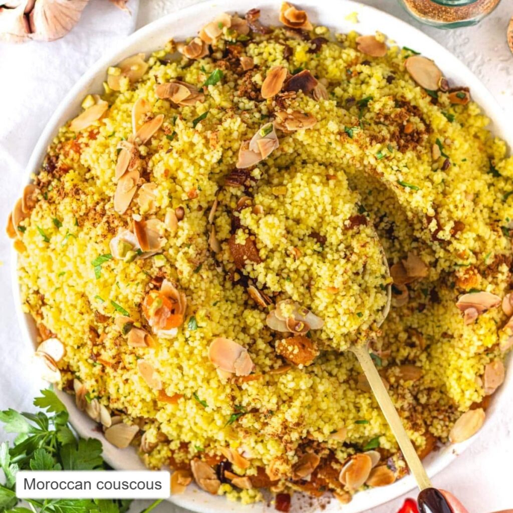 - Couscous: Tiny grains made from wheat, steamed and served with meat, carrots, potatoes, and chickpeas.